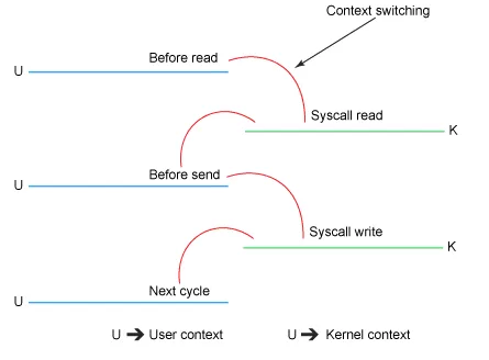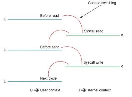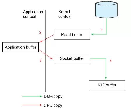 在Kafka上,有两个原因可能导致低效:1)太多的网络请求 2)过多的字节拷贝。为了提高效率,Kafka把message分成一组一组的,每次请求会把一组message发给相应的consumer。 此外, 为了减少字节拷贝,采用了sendfile系统调用。为了理解sendfile原理,先说一下传统的利用socket发送文件要进行拷贝: