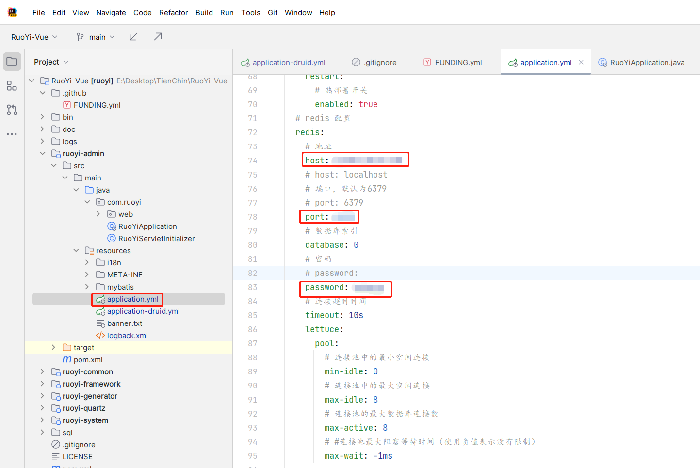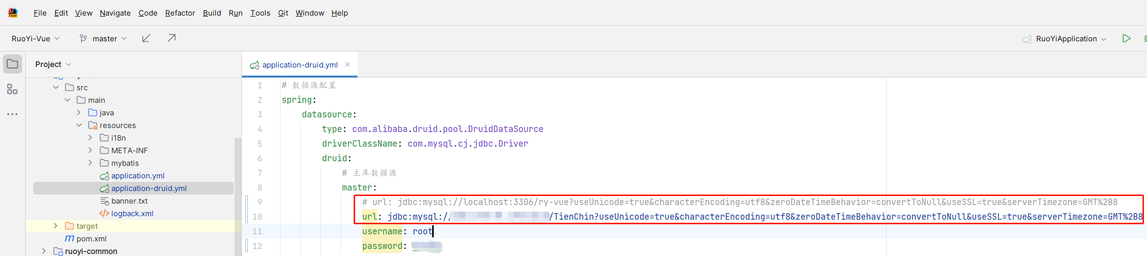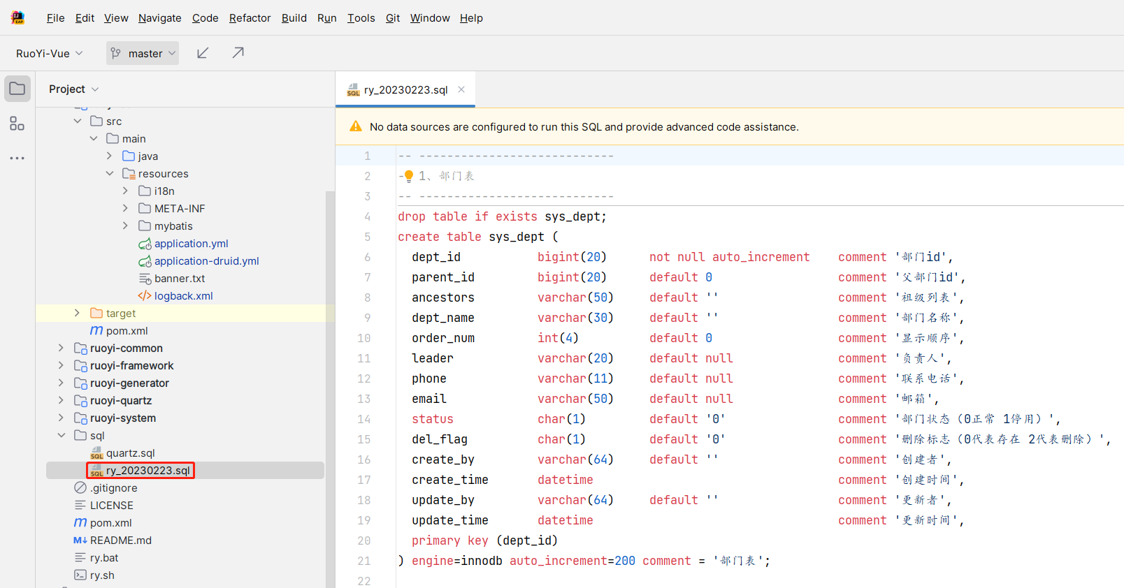复制出来前端过后,我们先来更改后端,更改 MySQL 服务器地址,更改完毕之后运行 RuoYiVue 当中的 SQL 脚本,需要自己新建一个数据库大致步骤如下