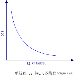 多线程场景,如果把服务端的线程数提升到2,那么整个系统的QPS则为 2*(1000/80) = 25, 可见QPS随着线程的增加而线性增长,那QPS上不去就加线程呗,听起来很有道理,公司也说的通,但是往往现实并非如此。