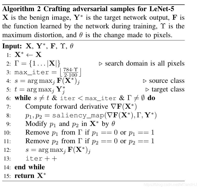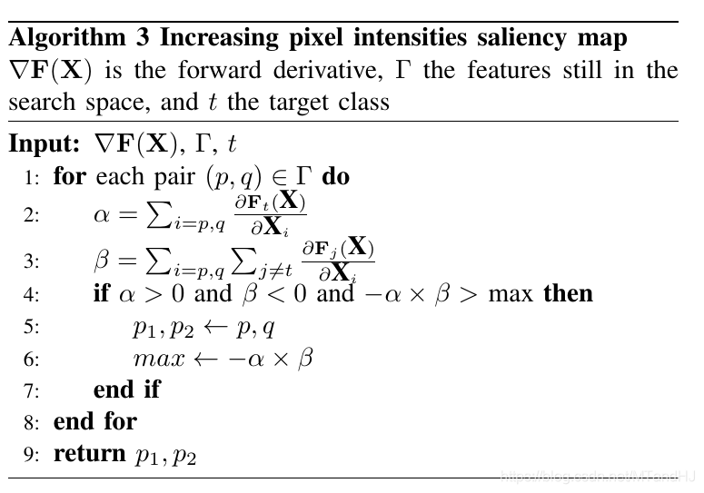 作者希望改动部分元素, 即\(\|\delta_X\|_0\le \Upsilon\), 作者是构造了一个saliency_map来选择合适的\(i\), 并在其上进行改动, 具体算法如下:
