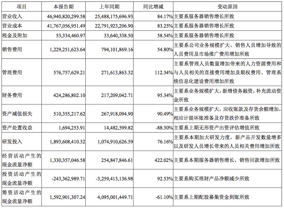 浪潮信息2018年营收469.4亿元,同比增长84.17%;净利润6.59亿元,同比增长54.05%。