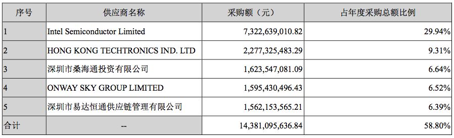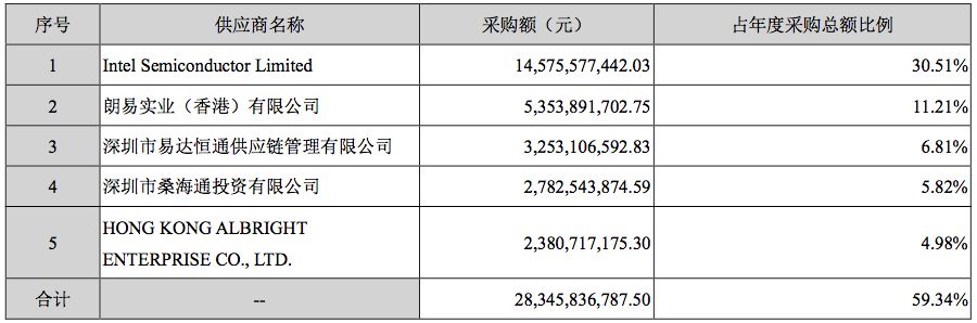 经查询 2017 年报,前五大供应商 Intel 依然居首,采购额 73.22 亿元。
