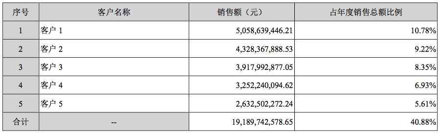 客户1销售额 50.59 亿元,客户2销售额 43.28 亿元,客户3销售额 39.18 亿元,客户4销售额 32.52 亿元,客户5销售额 26.32 亿元。合计 191.89 亿元,占比 40.88% 。