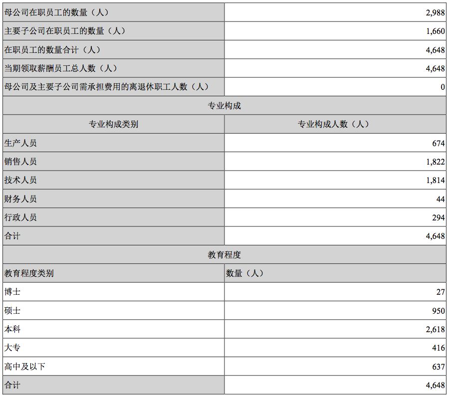 生产人员 674 人、销售人员 1822 人、技术人员 1814 人。财务及行政分别是 44 人、294 人。