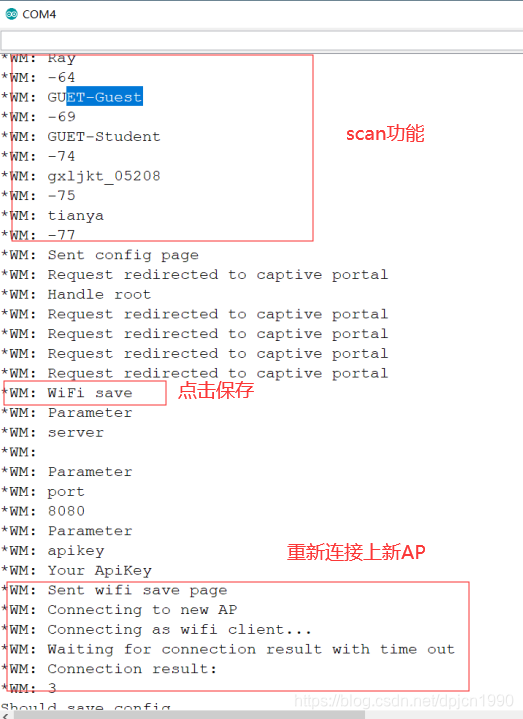 由于代码中打开了串口调试功能,所以可以看到以下调试信息:
