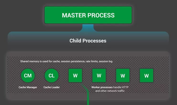 工作进程起始于socket监听事件(accept_mutex 和 kernel socket sharding),事件由新的连接进行初始化,接着这些连接被派发给某个状态机—HTTP状态机是其中最常用的一种,不过NGINX也实现了基于流的状态机、基于通信协议的状态机(SMTP, IMAP, and POP3)。