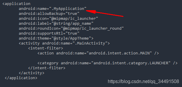 Application和Activity,Service一样是Android框架的一个系统组件,当Android程序启动时系统会创建一个Application对象,是维护应用全局状态的基类,用来存储系统的一些信息。Android系统自动(默认的,不管你有没有定义)会为每个程序运行时创建一个Application类的对象且只创建一个,所以Application可以说是单例(singleton)模式的一个类。如下清单文件mainiftest中的application就是整个基类。