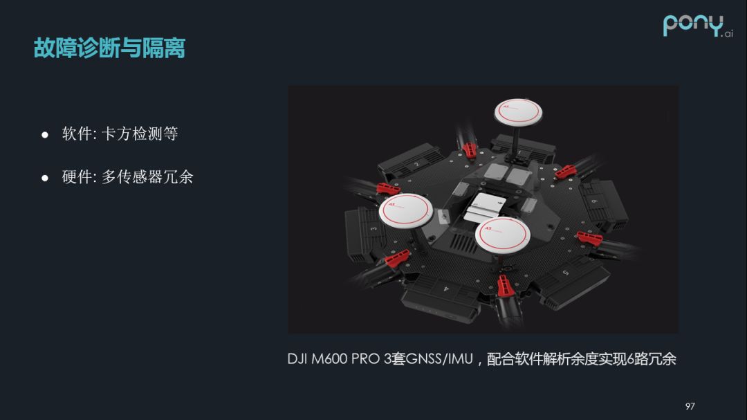 下面简单介绍下故障诊断与隔离,传统的软件方法有很多,比如卡方检测等,另外是硬件上的冗余。如果我们可以配备多套 GNSS/IMU ,我们可以配合软件解析余度实现多个冗余,来提高可靠性。
