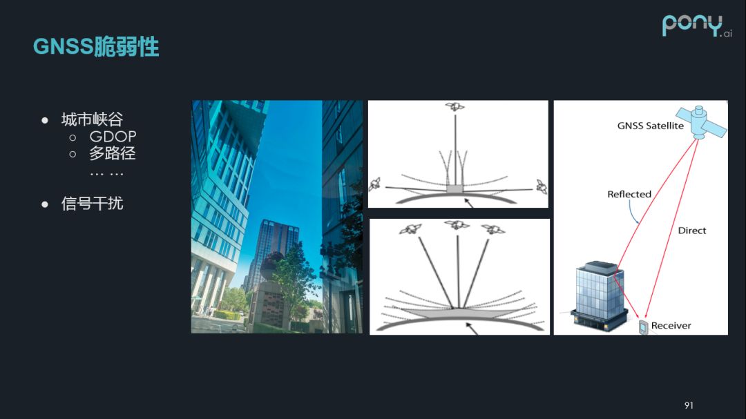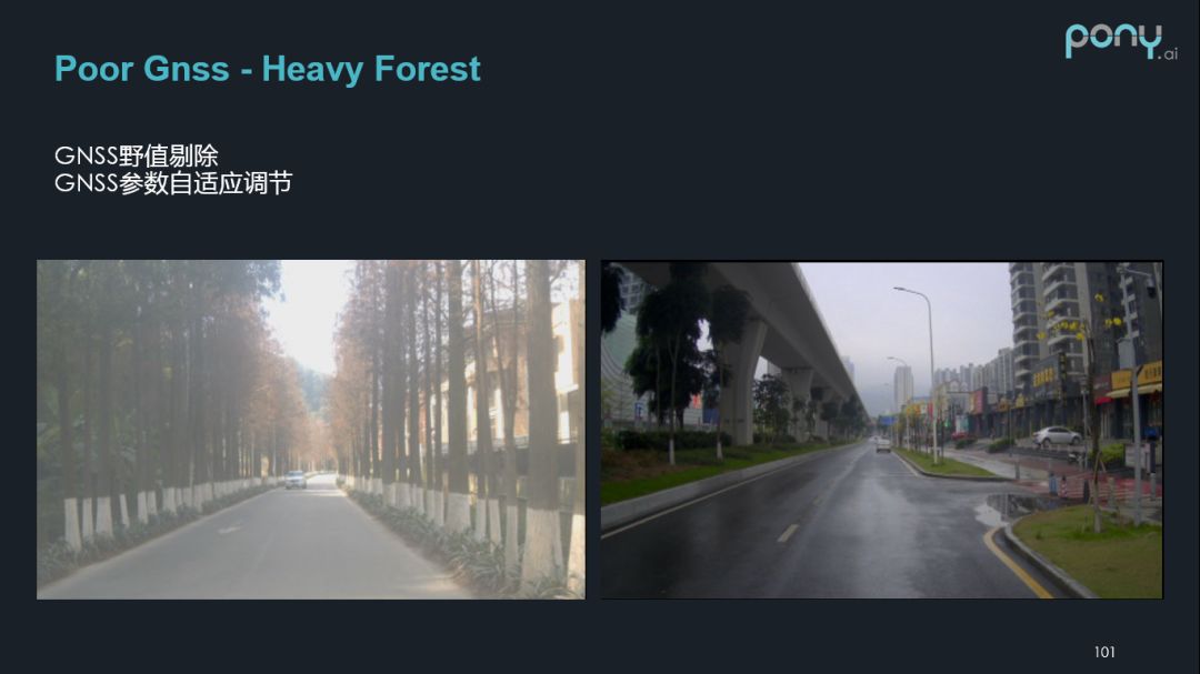 这俩个场景是对于卫星导航来说非常恶劣的场景,需要我们从传感器融合部分去处理,使其具有野值的剔除能力,以及对它参数的自适应调节能力。