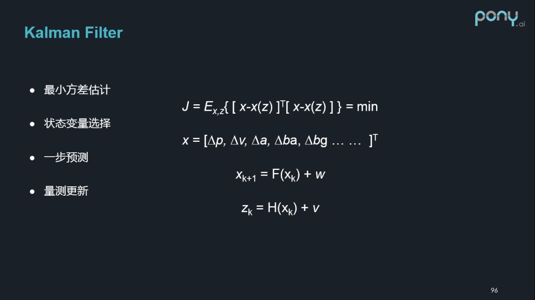 目前我们的导航定位优化方法,还是基于传统得卡尔曼滤波器,其优化的一个指标是使状态方差达到最小。在建立 Kalman Filter 模型的时候,首先要选择状态变量,目前我们还是基于导航参数误差+车载的传感器误差,作为状态估计。然后状态方程通过一步预测和量测更新,实现我们在时间域的递推。