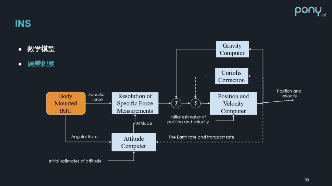 另外,IMU 的敏感轴,很难保证与车的运动方向是完全平行的,所以需要做一个精确的标定,除了轮速的输出,要得到有用的车速信息和里程信息,需要做一些推算,需要一些车轮的参数,而车轮的参数会随着我们的工况发生变化,所以我们需要对它做在线的估计。在这个过程中,我们的计算误差会随着运动的距离发生积累,且会受到路况的影响,比如轮胎打滑或者过减速带。