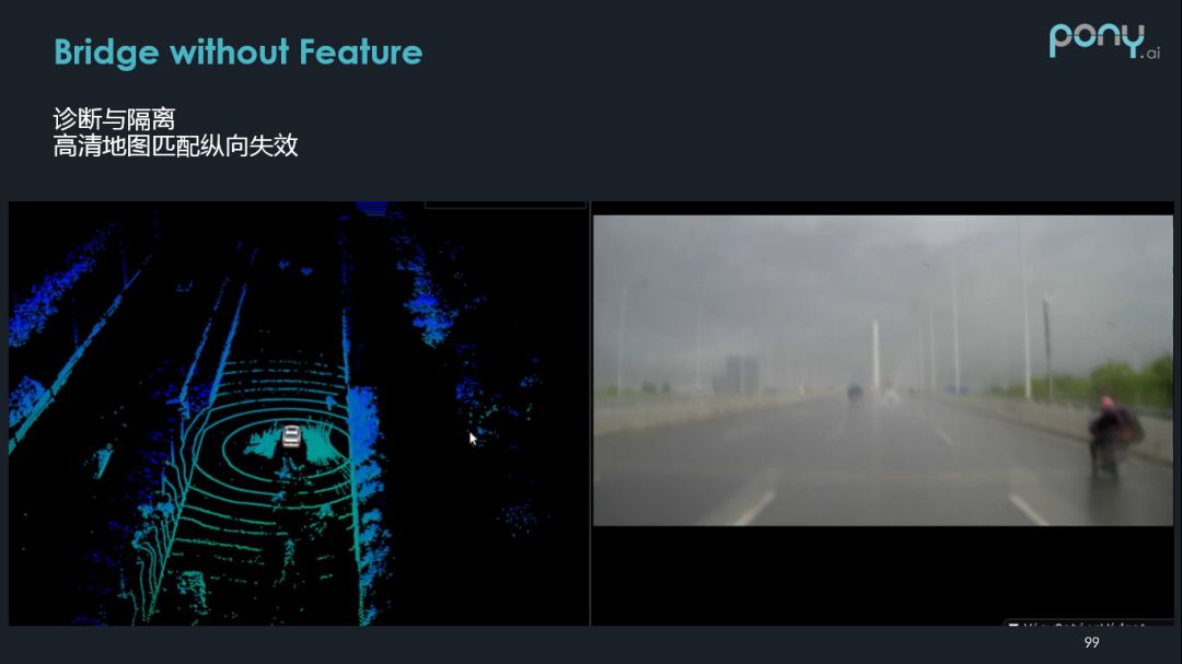 这个场景是我们的车辆运行在一个激光雷达纵向特征非常不明显的桥上,导致我们的高精定位在纵向上失效情况。解决办法是使用 GNSS, IMU,Wheel Sensor 信息,检测 scan match 纵向失效情况, 使其不影响定位系统输出。