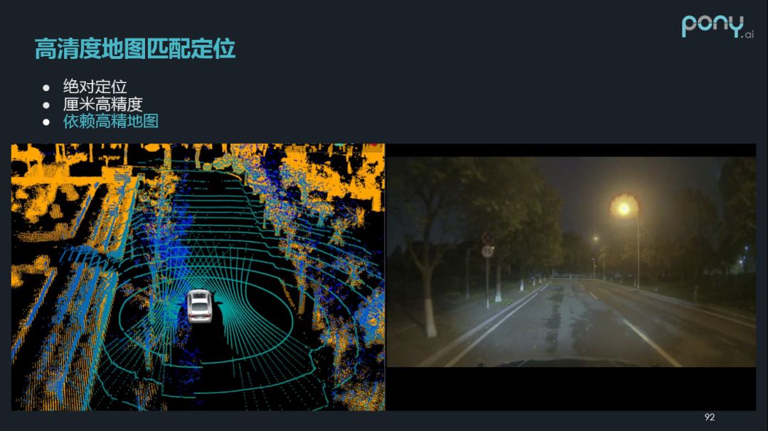 接下来是基于高清度地图匹配定位,它是事先建立的高精度地图,配合我们线上的激光点云,可以做到绝对定位,厘米级高精度,它的一个显著的局限性是增加了我们对高精地图的依赖。