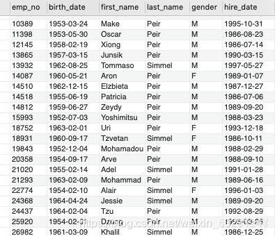 - IN-现在,要从employees表中选取姓氏为 ‘Simmel’和’Peir’ 的人