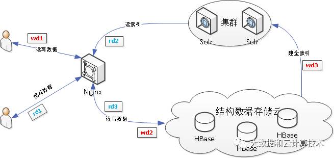 wd代表用户write data写数据,从用户提交写数据请求wd1开始,经历wd2,写入MySQL数据库,或写入结构数据存储云中,wd3,提交到Solr集群中,从而依据业务需求创建索引。