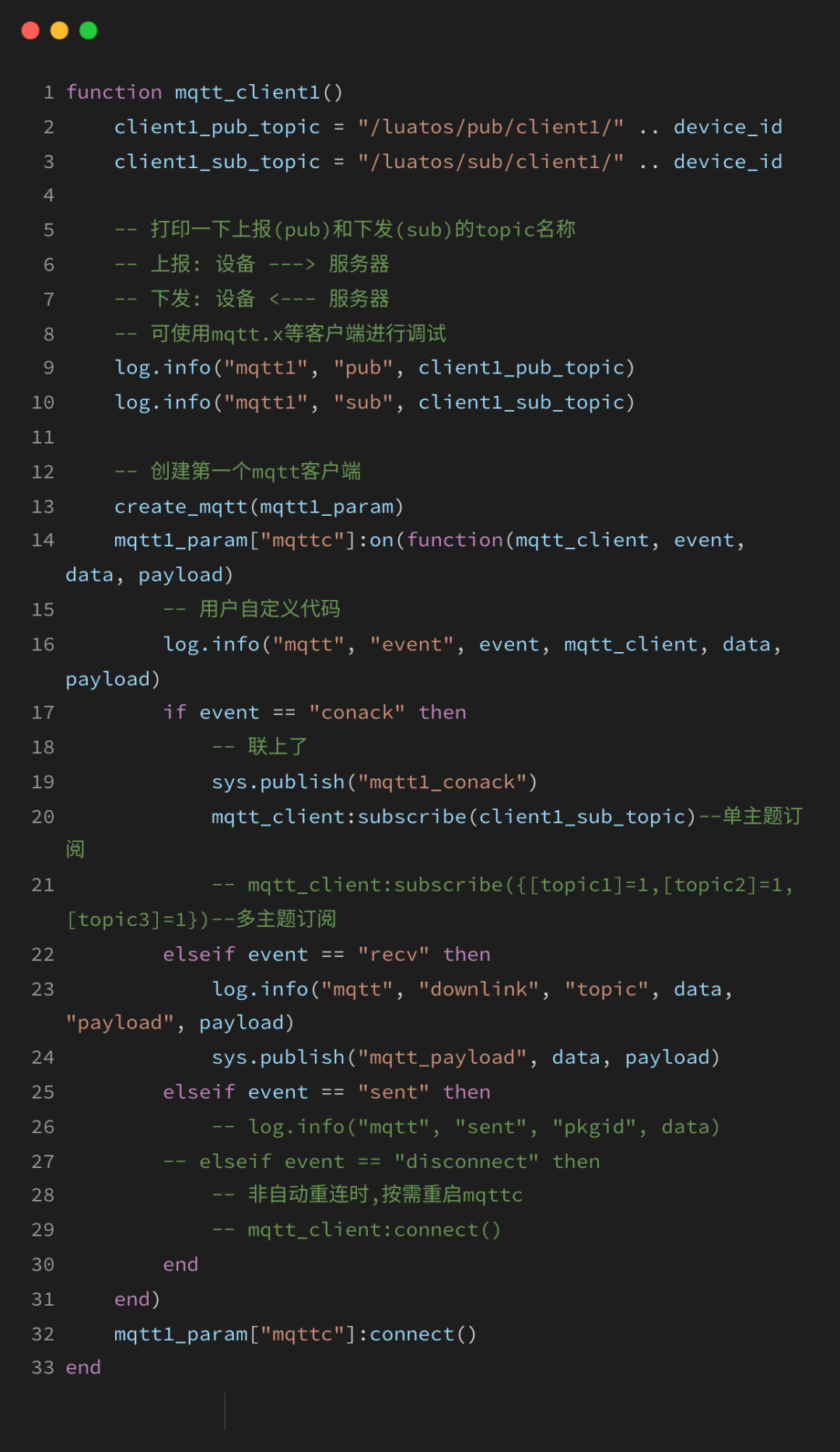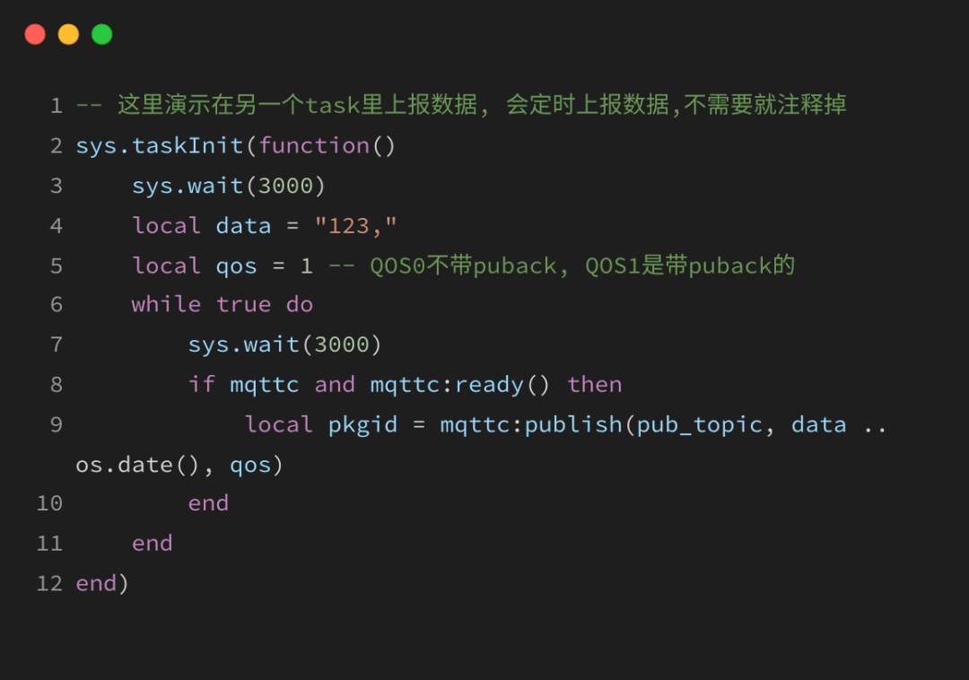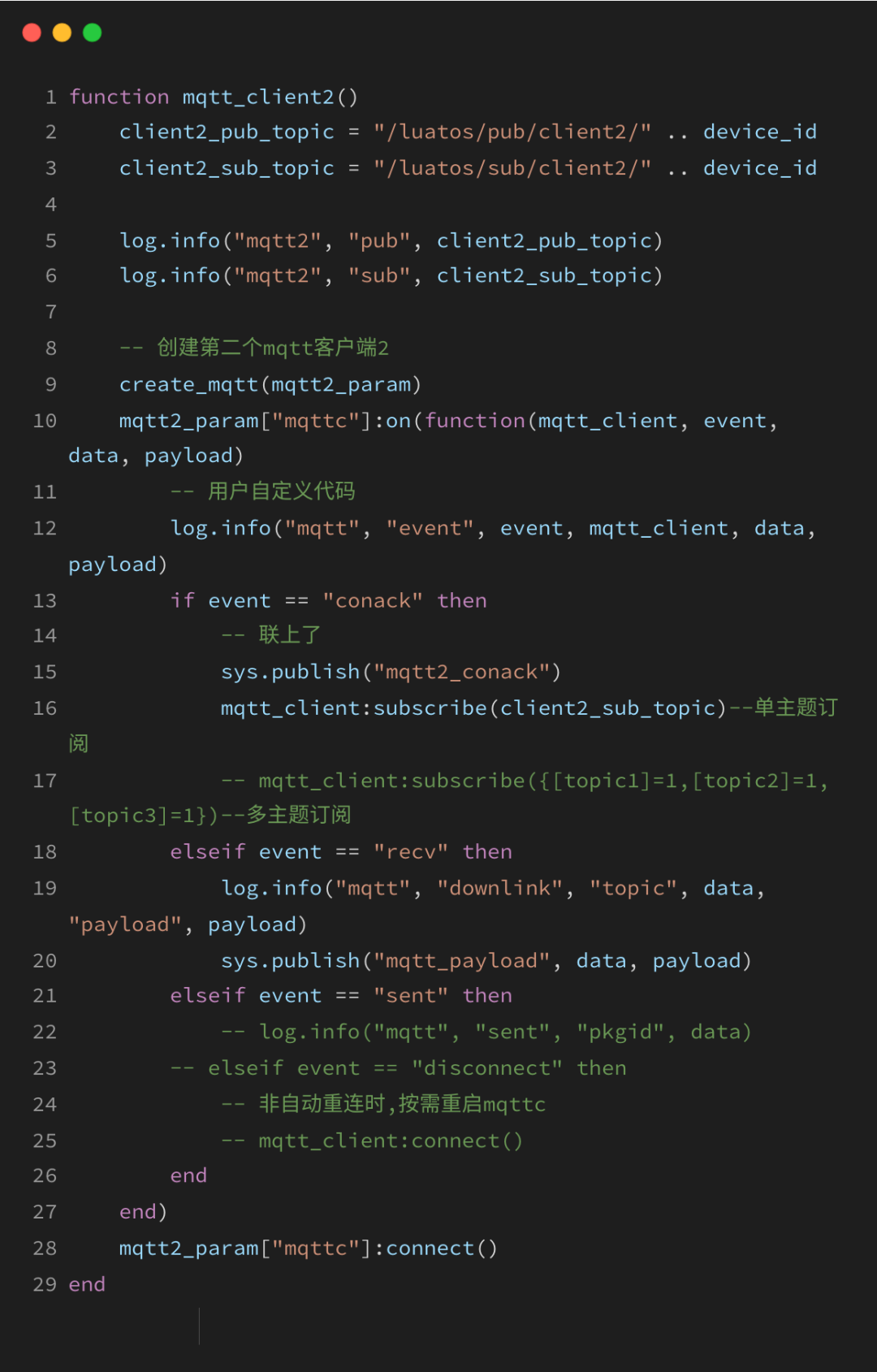 2)其余代码部分就与MQTT单链接示例中的single_mqtt.lua 代码相同,同样为避免重复信息过多,影响阅读感受,大家可转到上文2.2 single_mqtt.lua说明进行了解。