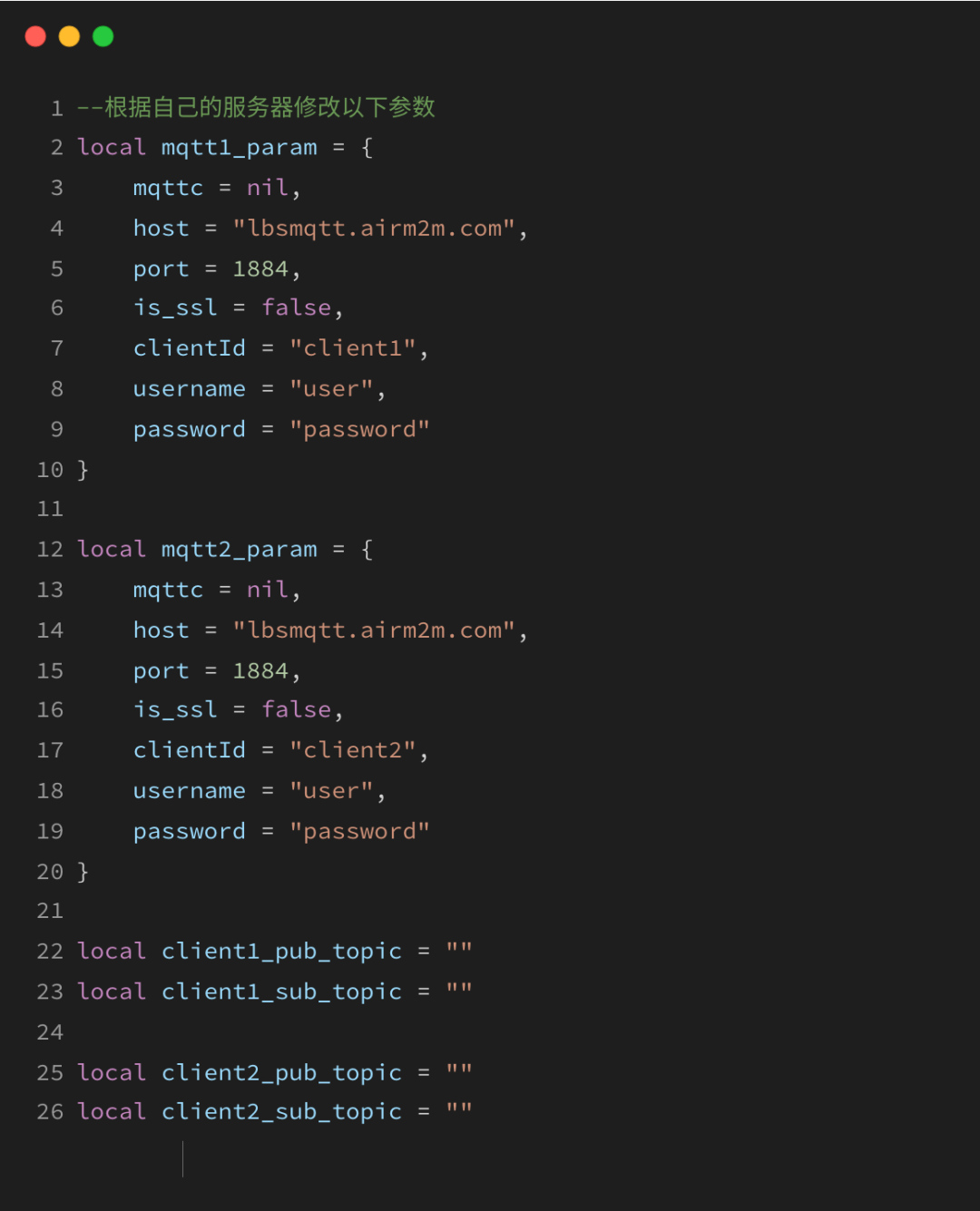 下面将对single_mqtt.lua中的代码进行简单说明,并指导大家修改指定参数,以便顺利进行MQTT单链接操作。
