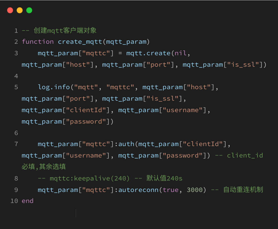 使用mqtt.create创建一个MQTT客户端对象,并将其存储在mqtt_param表的mqttc字段中;