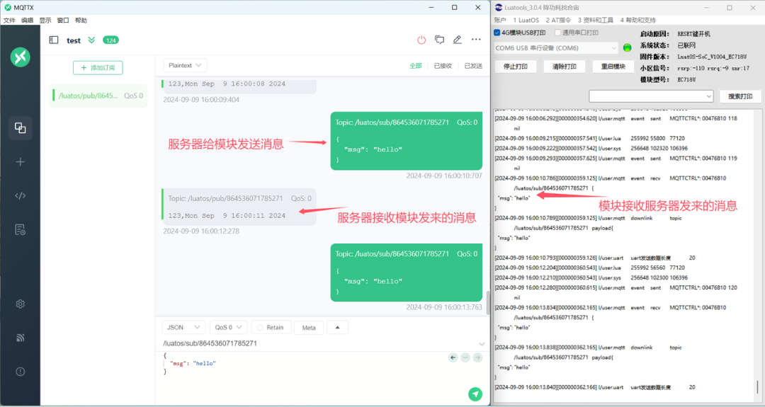 前面代码中所提到的mqtt-uart透传实现效果图如下所示: