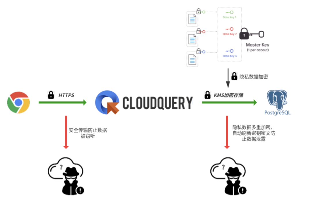 CloudQuery 从技术和管理两个维度来保障企业的数据安全,我们要做的是确保存储在所有业务空间的数据得到保护,规避对敏感数据的非法访问和窃听。