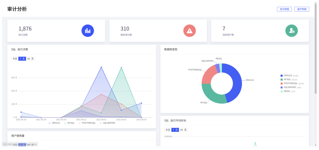 审计系统采用流式计算引擎结合大数据分析技术,及时高效的处理每一条SQL语句。审计系统可以统计分析执行总数、平均耗时、错误语句、危险语句等数据并进行可视化图表展示;支持慢SQL分析、SQL注入漏洞分析、危险操作分析并及时预警。