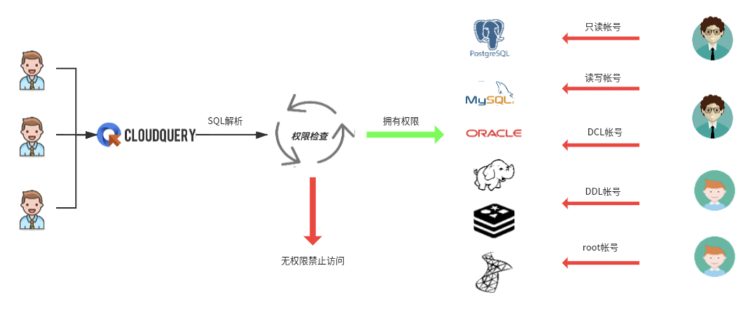 使用 CloudQuery 管理权限时,不需要为每个使用者创建不同权限的数据库帐号。CloudQuery 在软件层面实现丰富的权限管理,满足各种应用场景。