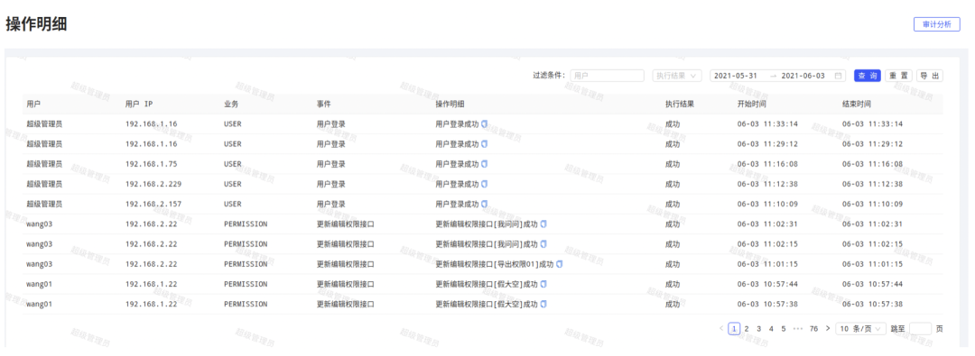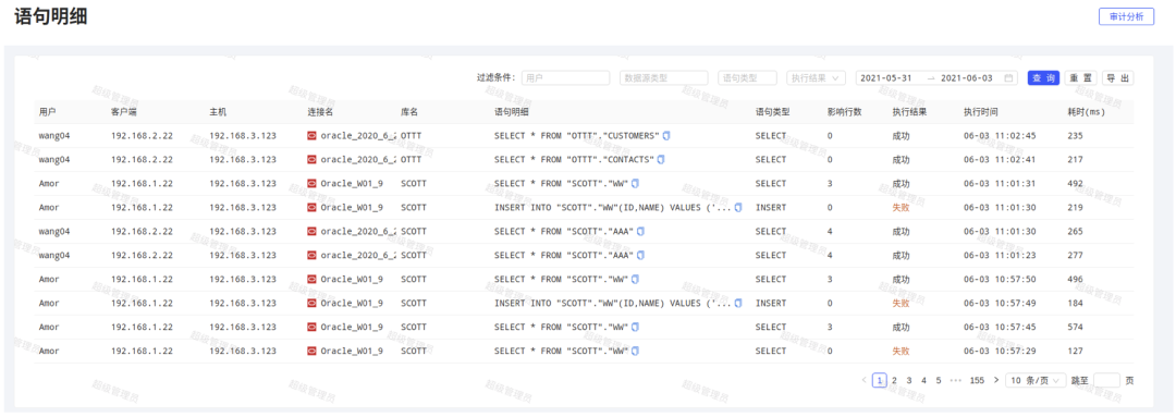 CloudQuery 完整的记录了用户在系统内部的行为,包括登陆、打开连接、查看表、导出数据等操作明细,还包括执行过的 SQL 语句、执行时的 ip 地址、执行结果和耗时等重要信息,通过这些关键信息可以快速定位到某条语句的执行人和执行 ip 地址。