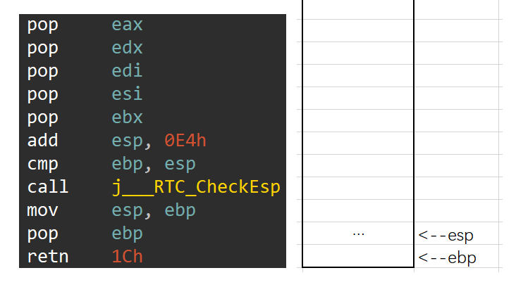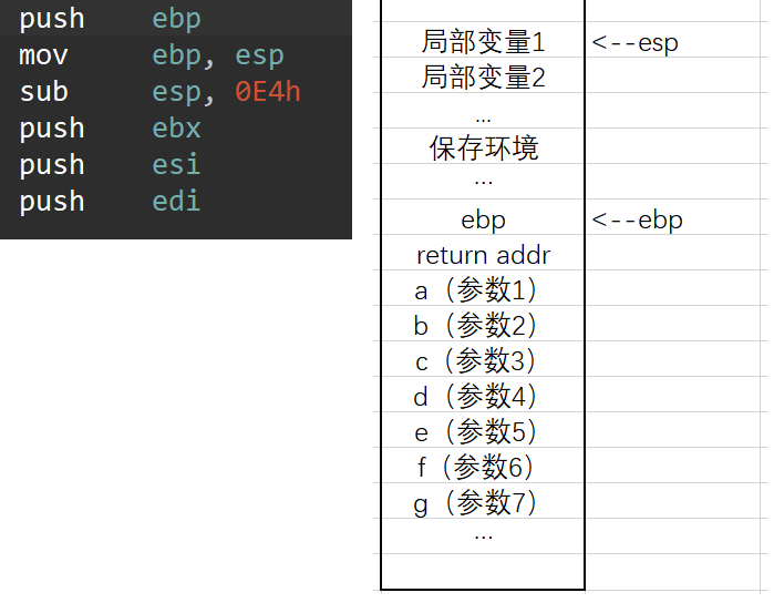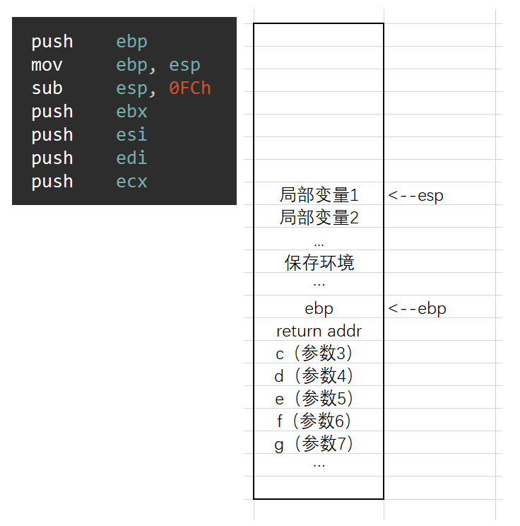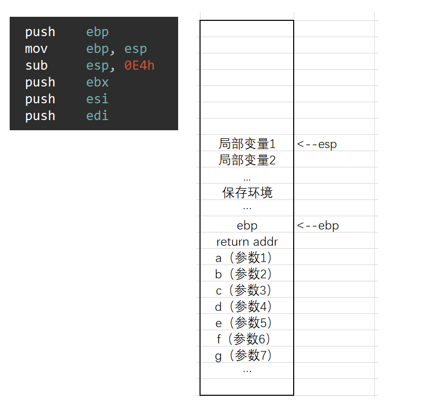 | fastcall | ecx(参数1),edx(参数2),push(从右到左) | 函数内平栈 |