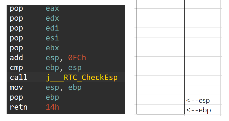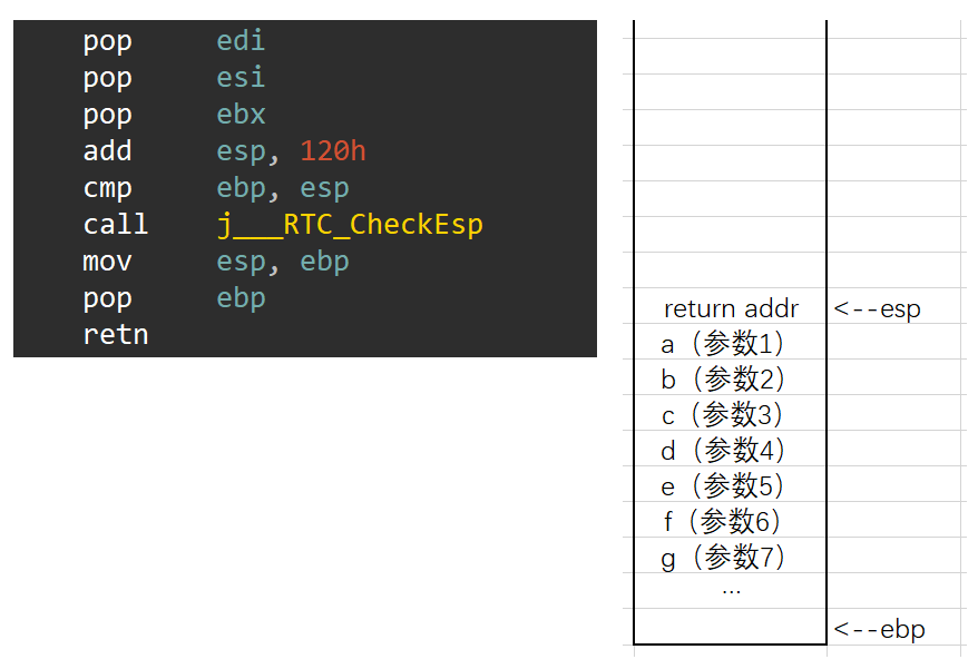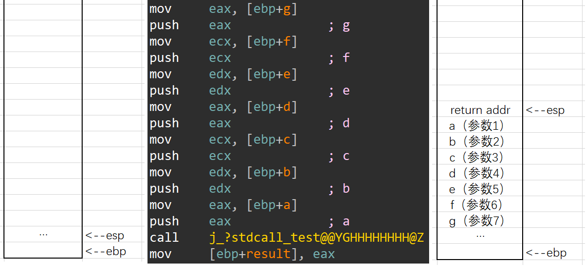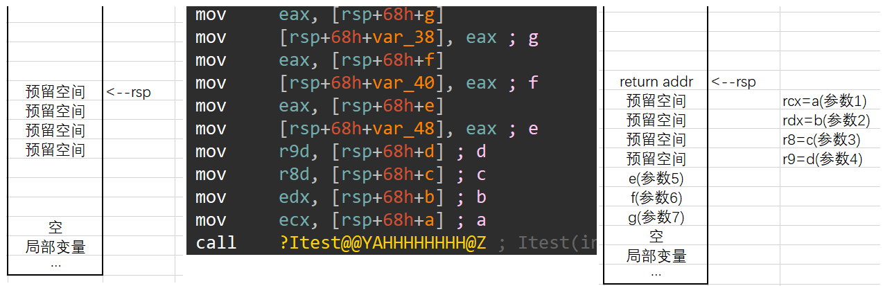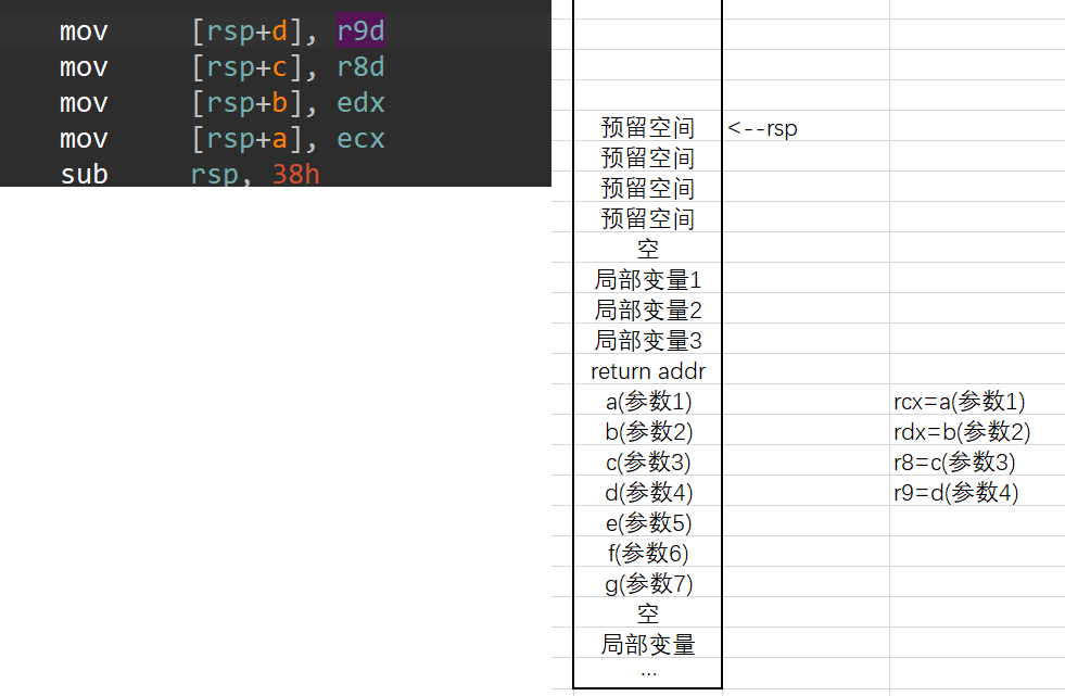 | vectorcall(浮点参数) | xmm0 | xmm1 | xmm2 | xmm3 | 堆栈传递 | 函数内平栈 |