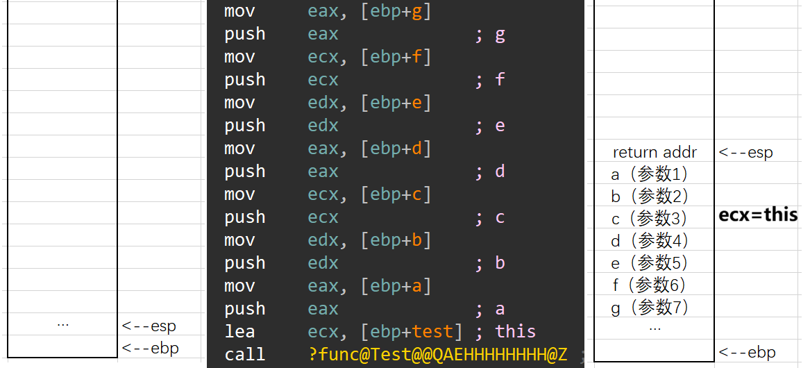 | thiscall | ecx(this指针),push(从右到左) | 函数内平栈 |