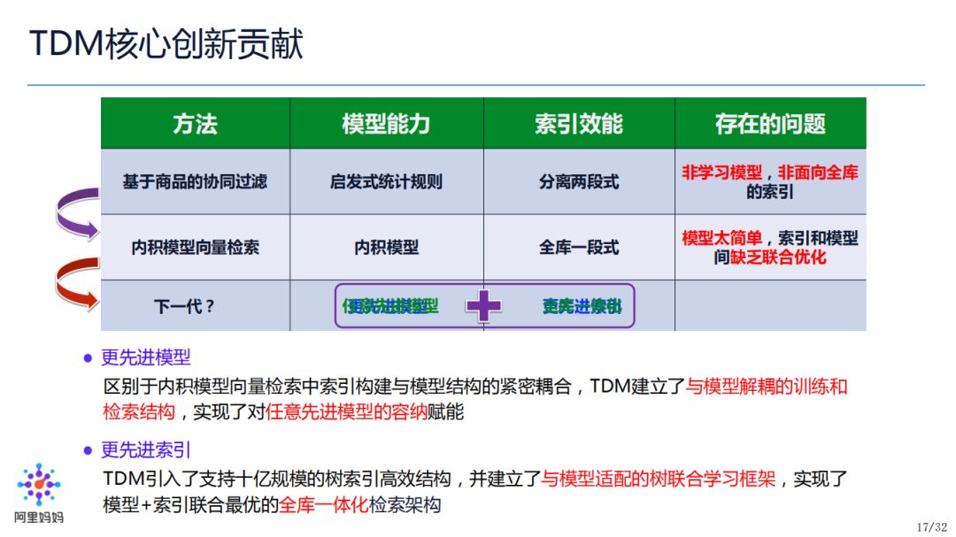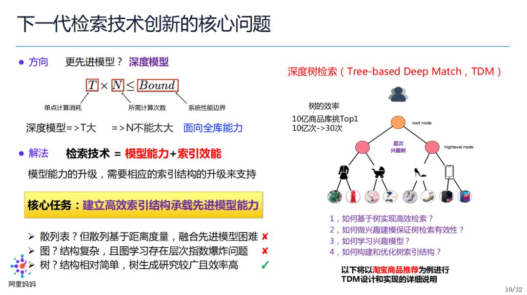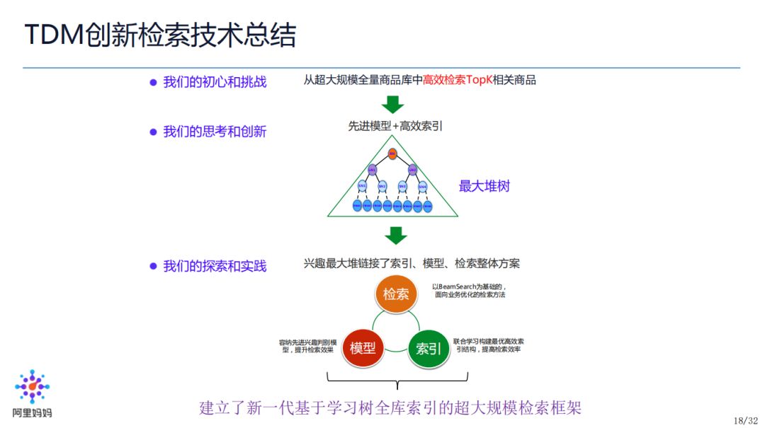 从这个角度,大家思考一下,TDM 为什么可以解决这个融合呢?我们实现了对更先进模型,即深度学习模型的融合;其次,我们实现了更先进索引,采用了树结构来做索引,有别于常用的倒排索引,并且我们的树结构是一个与模型适配且联合学习的树。