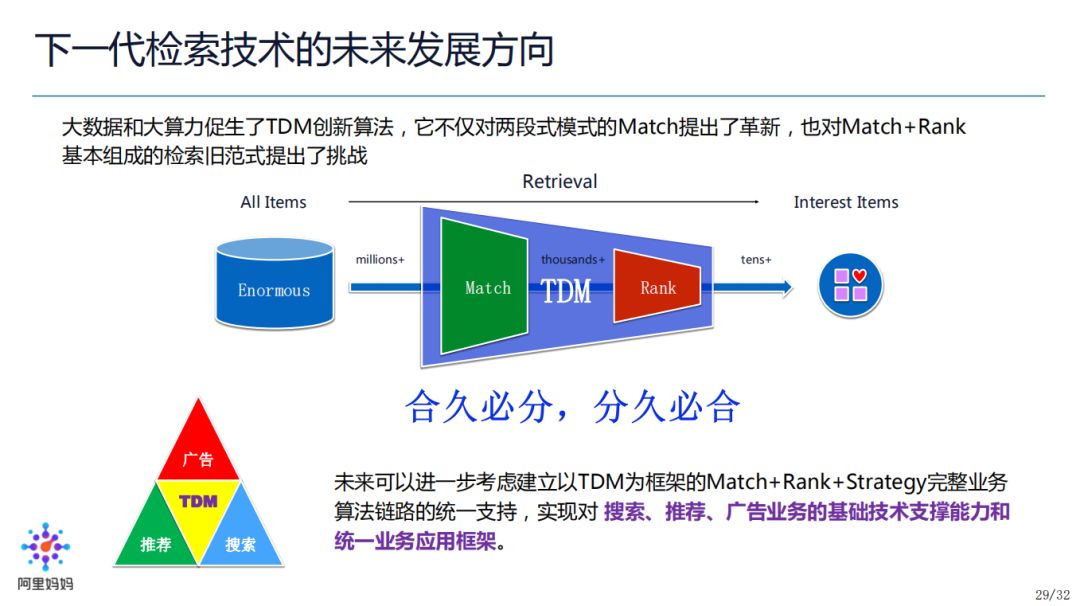 “合久必分,分久必合”,受限于数据发展的爆炸式增长,和计算性能的限制,两段式 Match+Rank 统治了检索架构的主流,但在大数据+大算力的大环境下,我们需要对算法做出改变,为此 TDM 突破了原有的架构约束,做出了部分创新工作,实现了端到端联合优化的一体化检索框架。