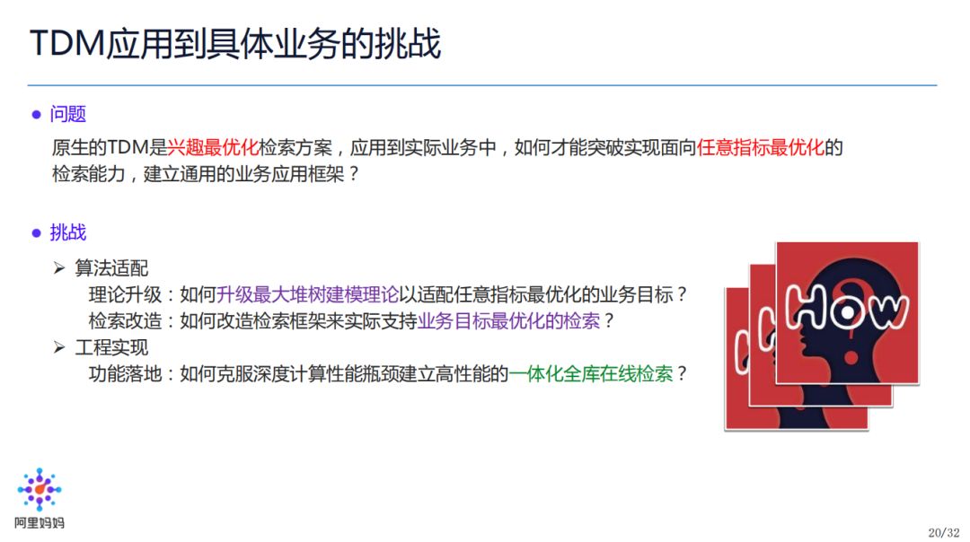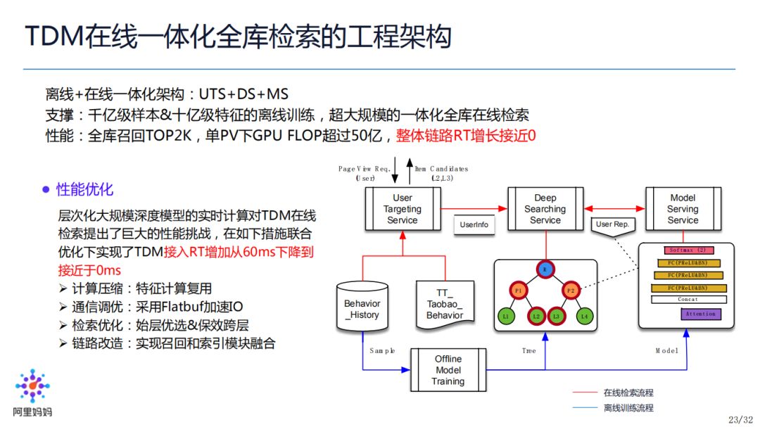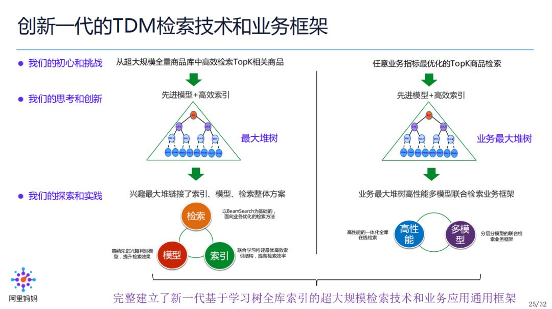 最后,从学习树全库索引的检索,我们进一步把 TDM 扩展到了通用的业务应用框架。左边纵向为基于学习树全库索引的超大规模检索是如何设计的,右边纵向为如何应用 TDM 到线上业务,包括改造成业务最大堆树,然后面向业务的高性能优化和多层多模型的设计,最后真正应用于实际。