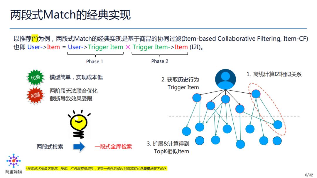 Match 两段式的经典实现如图中 Item-CF 所示,这里不做过多论述。如前述说的,它的优势是模型比较简单,实现成本较低,劣势是两段式无法联合优化,各阶段的标签截断导致效果受限。由此,我们自然会想到一个问题:两段式有缺陷,那我们是否可以改为一段式?