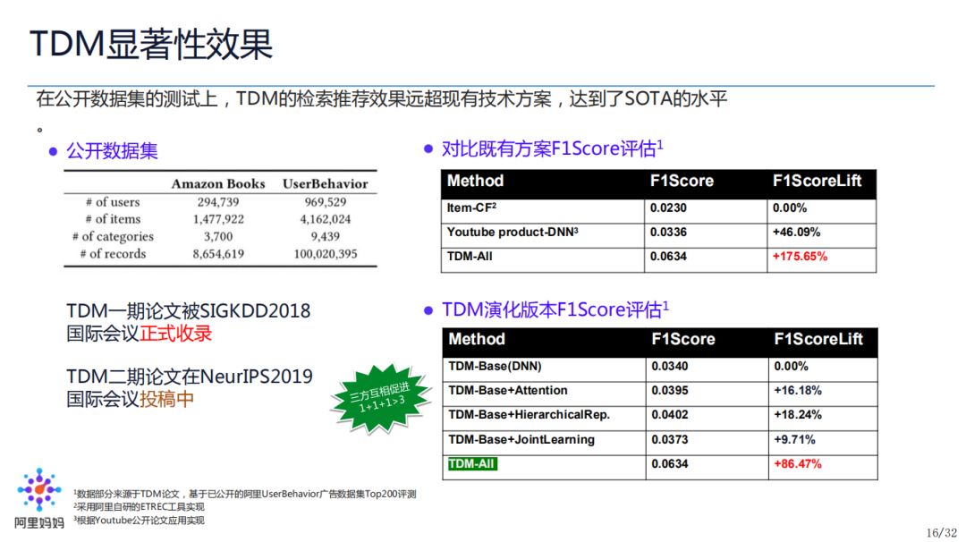 TDM 在 AmazonBooks 和 TaobaoUserBehavior 两个公开数据集上进行了测试。相对于基线的 ItemCF 和 Youtube 内积模型,TDM 的提升非常显著。我们也对 TDM 各种优化做了单项拆分分析,Attention、HierarchicalRep. 和联合学习的效果如之前所说,其中三者的联合效果达到了1+1+1>3。