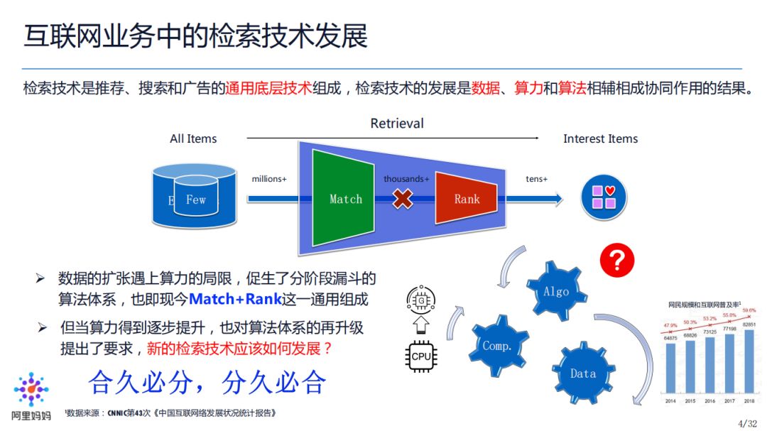 数据在发展,算力体系也在发展,尤其是随着近十年来 GPU 大规模应用的兴起,形成了 CPU+GPU 异构计算的算力大融合。在大数据+大算力的现状下,我们开始思考,检索算法架构是不是可以再升级?类似于历史中的“合久必分,分久必合”:我们是不是可以突破 Match+Rank 的分段漏斗模式,将检索问题作为一个端到端整体去设计和联合优化?这就是我们今天要探讨和思考的问题,也是 TDM 的由来。