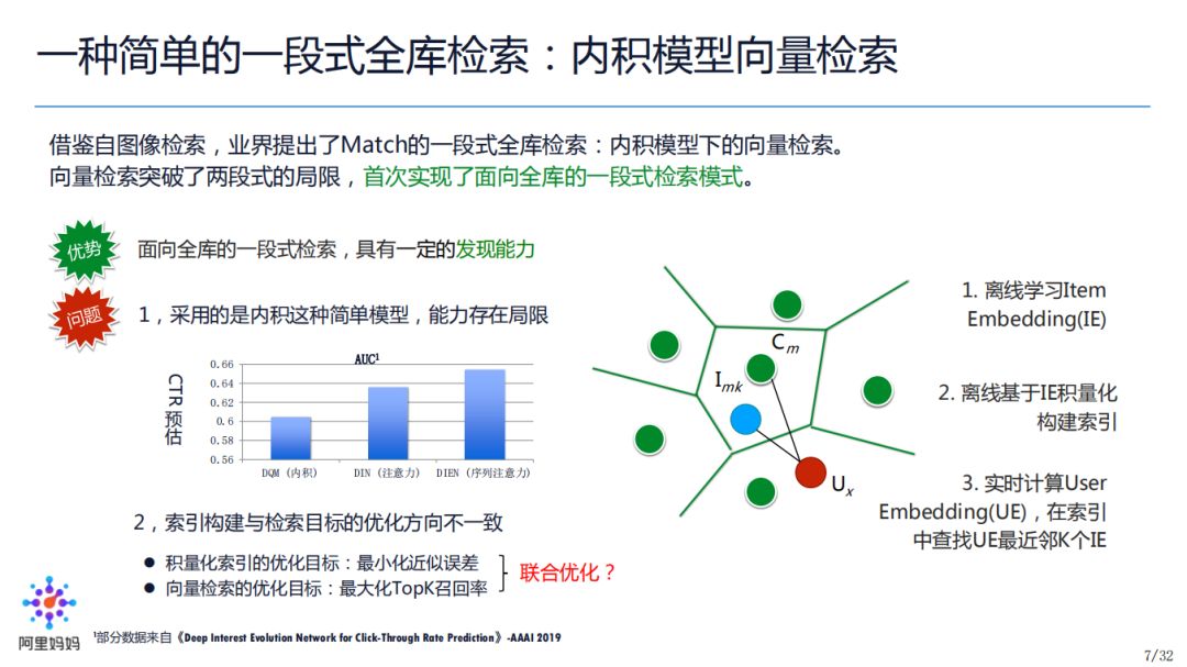 内积模型向量检索,模型能力:内积模型;索引效能:全库一段式;问题:内积模型相对简单(问题:为什么是内积而不能是其他更复杂的模型如 DNN?留给读者思考);索引和目标之间没有联合优化。