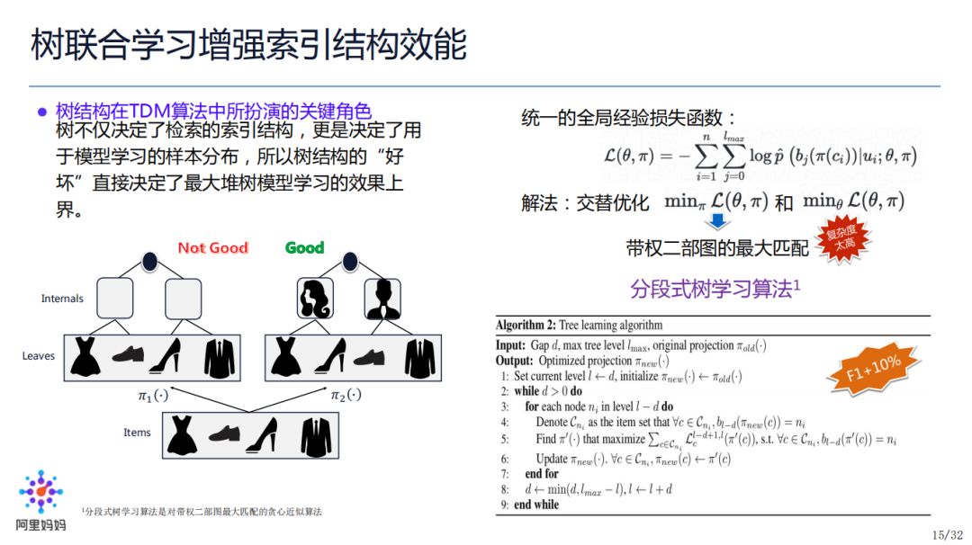 为了达到模型和树的联合最优化,我们建立了统一的全局经验损失函数(如右上公式),并通过交替迭代的方式进行模型参数 θ 和映射函数 π 的联合优化。其中 π 的优化是一个带权二部图的最大匹配问题,复杂度比较高(O(n^3)),为此我们建立了右下的贪心近似算法(Algorithm2)来优化 π。最终的效果是这种联合优化让 F1 提升近10%。
