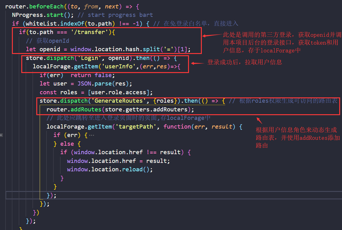 在app.vue的mounted输出this.$router对象,发现options.routes数组并没有将动态路由添加成功,这个问题困扰了很久,最后找到原因是执行了window.location.reload();使得页面重新加载了,解决办法是:在beforeEach里判断当前路由是否已经有动态路由了,如果没有则添加,并且拉取用户信息的处理不放在登录成功之后,这样就不会受reload的影响
