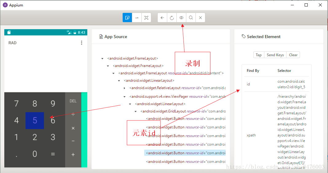 运行后(注意appium desktop运行状态才能使用工具进行定位