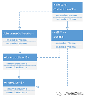 从上面的结构图可以看出,集合框架的主题架构其实是以类为主体的,而不是接口。如果知道类、抽象类和接口之间的区别与联系,就能明白这里引入抽象类的原因。简单地说,如果不引入抽象类,每个具有Collection接口属性的类别都必须自己去实现该接口中的10多个方法,通过让类别直接继承自AbstractCollection这个抽象类,去除了重复代码。