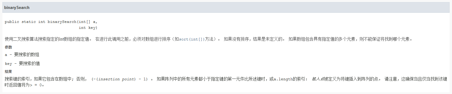这里需要注意一点,Arrays.binarySearch()方法如果找不到元素,返回的不是-1,而是一个小于0的数,这个数是多少呢,查看API手册得知: