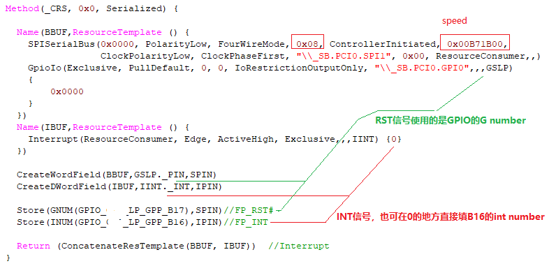 2. RST#是使用的GPIO功能,所以直接调用API来拉低就行了,CS#是native功能,需要首先配置为GPIO mode,然后拉低(针对GPIO的一系列操作,IHV的RC code里面都会提供c code和asl code下面的API)。