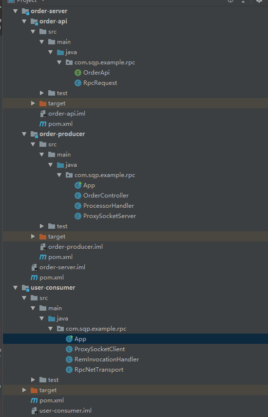 创建父工程order-server,子order-api,子order-producer,user-consumer的maven工程(也可以自己创建成独立的工程)。