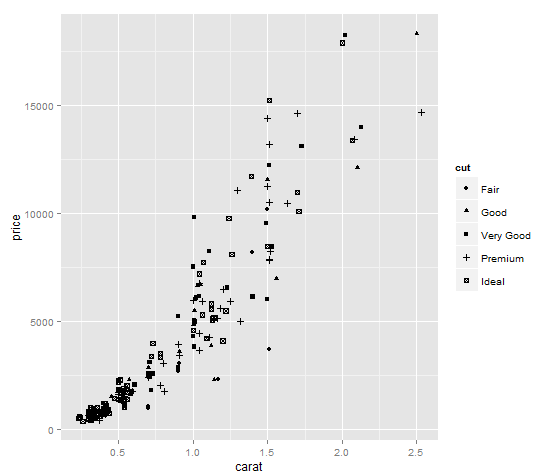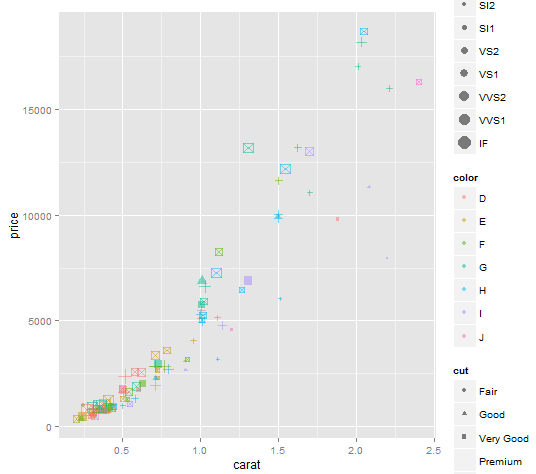 >p+geom_point(aes(color=color,shape=cut,size=clarity),alpha=.5,position="jitter")
