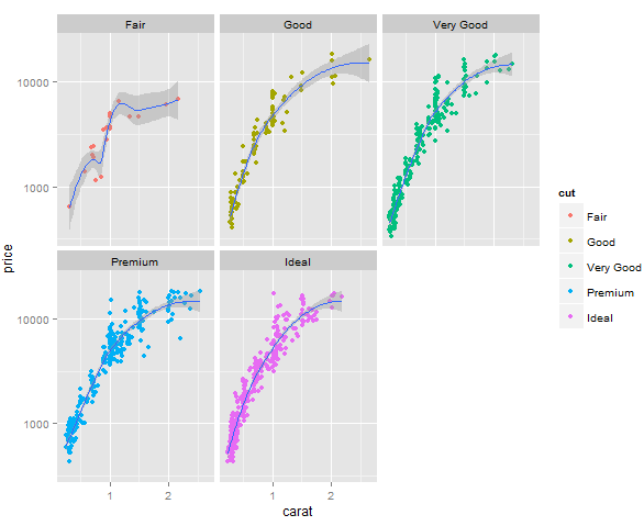 > ggplot(sample,aes(x=carat,y=price))+geom_point(aes(colour=cut))+scale_y_log10()+stat_smooth()+facet_wrap(~cut,ncol=3)