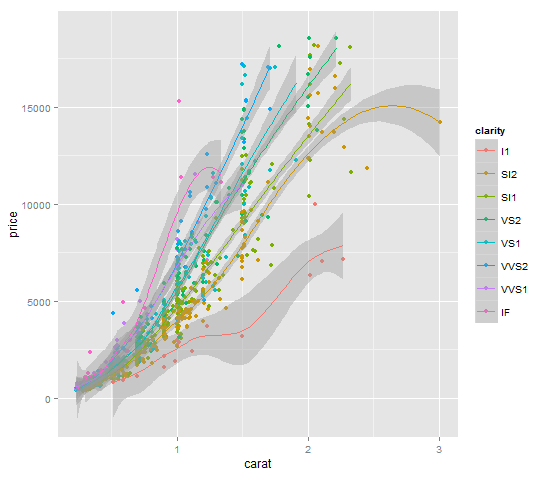 > p+geom_point(aes(color=clarity))+geom_smooth()