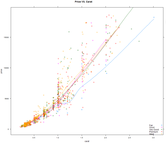 > xyplot(price~carat,data=sample,groups=cut,auto.key=list(corner=c(1,0)),type=c("p","smooth"),span=.7,main="PriceVS. Carat")