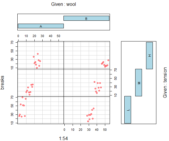 > coplot(breaks~1:54|wool*tension,data=warpbreaks,col="red",bg="pink",pch=21,bar.bg=c(fac="lightblue"))