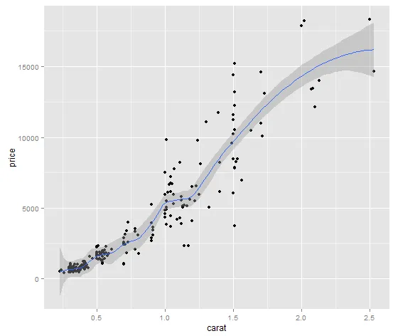 例如用stat_smooth对数据作loess平滑,在carat-price散点图上添加非线性回归线。